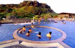 另一个绿岛著名观光景点-朝日温泉,为世界极稀有的海底温泉,是全台重要的观光资源之一。朝日温泉为绿岛后火山活动的仅余征兆,属硫磺泉,出现于珊瑚礁的潮间带中。类似的海水温泉,世界仅发现三处,另二处分别在义大利北方与日本九州,为相当稀有地质景观资源;它的水温在53~93.c间,可浴不可饮,但洗后并不粘腻。国家风景区在此设置三个圆形露天浴池与一个小型温泉泳池,温度各异,供游客自由选择。