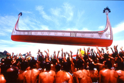 船主及青年们穿着丁字裤,在大船四周举行驱逐恶灵的仪式,随后抬起大船,抛向空中数次。直到新船下水,在海上划行,整个大船下水典礼才算圆满达成。