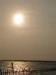 沿途,胶筏在舄湖内的蚵棚穿梭航行,广阔无垠的蚵田,如棋盘般地罗列,养蚵人家不时忙碌着,白鹭偶而低空飞过,相衬蔚为一景。