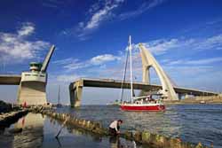 跨 海 大 桥 位 在 白 沙 、 渔 翁 两 岛 之 间 , 横 跨 怒 涛 澎 湃 、 潮 流 汹 涣 的 吼 门 水 道 。