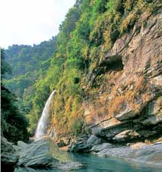 瀑布区该区呈峡谷地形,溪水侵蚀切割甚深,沿溪两岸形成险峻之断崖,构成本区主要景观。沿途可观赏溪谷美景并设有观瀑亭。
