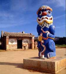 金门人立风狮爷的由来是在明末清初时,岛上居民因苦于风患,邪祟丛生,并且使植物不易生长,于是各个村庄便开始在庙口、村庄路口树立风狮爷,以期镇风,演变而成为聚落的守护神。风狮爷已成为今日金门的象征之一,庇佑百姓,驱魔镇风,是金门特有的人文景观与无价之文化资产。风狮爷多为石雕,造形则各有特色。